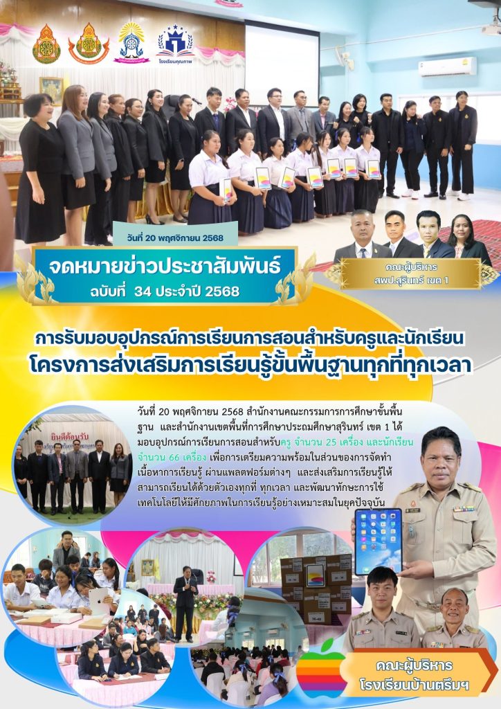 วันที่ 20 พฤศจิกายน 2568 สพฐ. และ สพป.สุรินทร์ เขต 1 ได้มอบอุปกรณ์การเรียนการสอนให้ครู จำนวน 25 เครื่อง และนักเรียน จำนวน 66 เครื่อง รวมทั้งสิ้น 91 เครื่อว เพื่อใช้ในการสนับสนุนการสอน และให้นักเรียนสามารถเรียนรู้ได้ทุกที่ ทุกเวลา