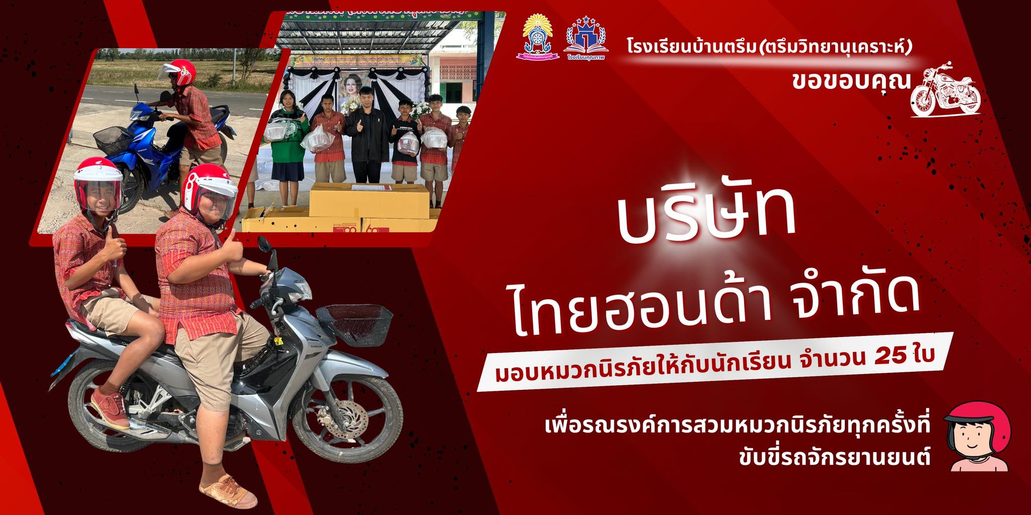 โรงเรียนบ้านตรึม(ตรึมวิทยานุเคราะห์) ขอขอบคุณ บริษัท ไทยฮอนด้า จำกัด ที่มอบหมวกนิรภัย จำนวน 25 ใบ รวมเป็นเงิน 10,700 บาท ให้นักเรียนสวมใส่เมื่อขับขี่รถจักรยานยนต์ทุกครั้ง #ปลอดภัยไว้ก่อน #ขับขี่ไม่ประมาท