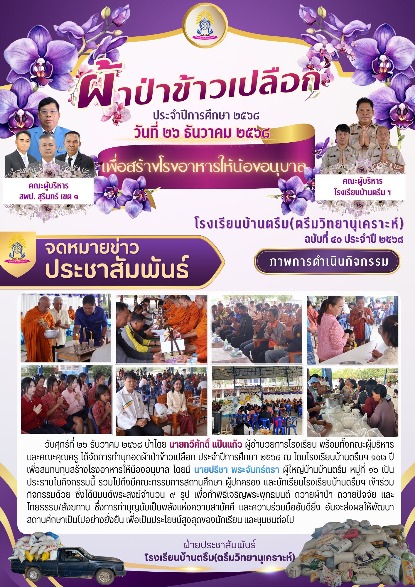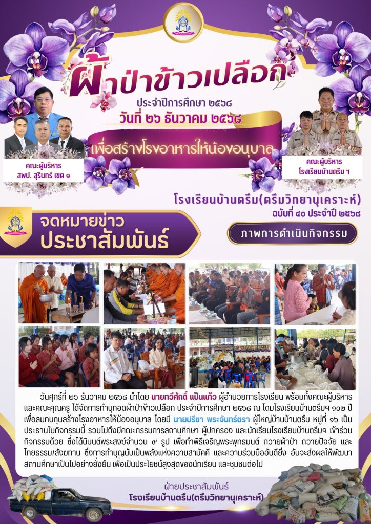 วันที่ 26 ธันวาคม 2568 โรงเรียนบ้านตรึม(ตรึมวิทยานุเคราะห์) จัดพิธีทำบุญทอดผ้าป่าข้าวเปลือก ประจำปีการศึกษา 2568 เพื่อสร้างโรงอาหารให้น้องอนุบาล ณ โรงเรียนบ้านตรึม(ตรึมวิทยานุเคราะห์) ขอขอบคุณผู้ปกครองทุกๆท่าน