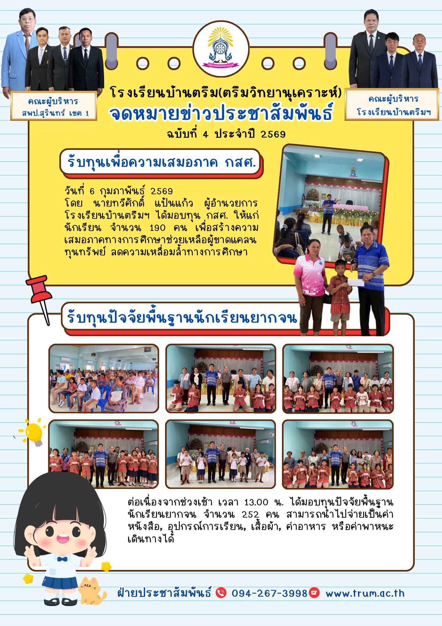 วันที่ 6 กุมภาพันธ์ 2569 นายทวีศักดิ์ แป้นแก้ว ผู้อำนวยการโรงเรียนบ้านตรึมฯ ได้มอบให้แก่นักเรียนทุน กสศ. จำนวน 190 คน และทุน ปัจจัยพื้นฐาน จำนวน 252 คน