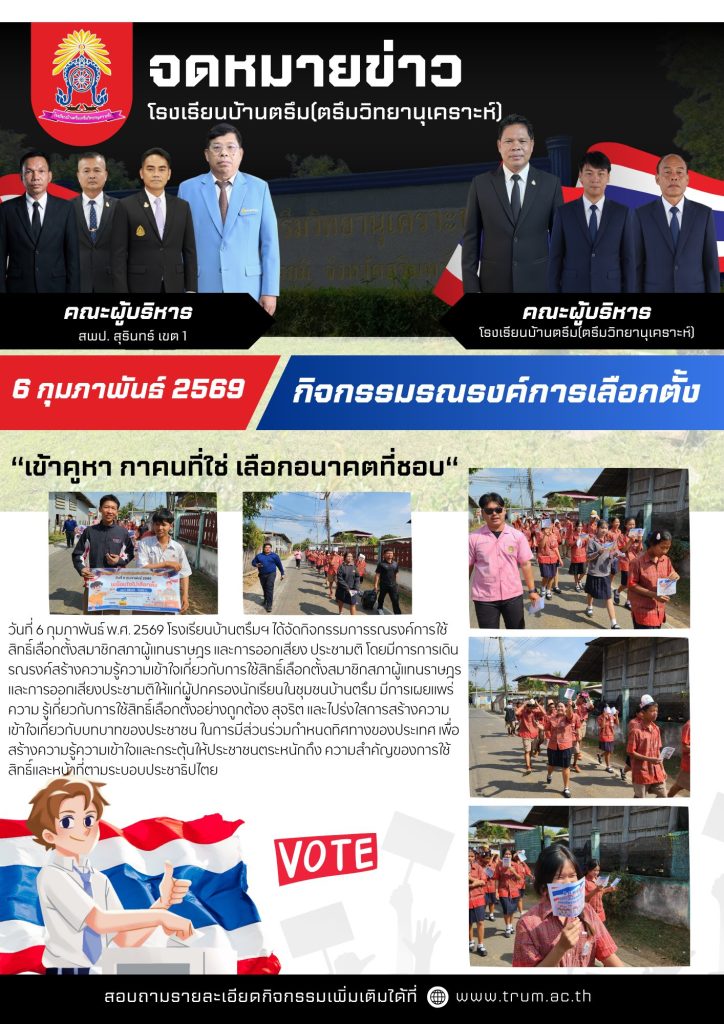 วันที่ 6 กุมภาพันธ์ 2569 โรงเรียนบ้านตรึมฯได้จัดกิจกรรมรณรงค์การเลือกตั้ง ขบวนเชิญชวนให้ชุมชน และชาวบ้านออกมาใช้สิทธิ์ในการเลือกตั้ง ในวันอาทิตย์ที่ 8 กุมภาพันธ์ 2569