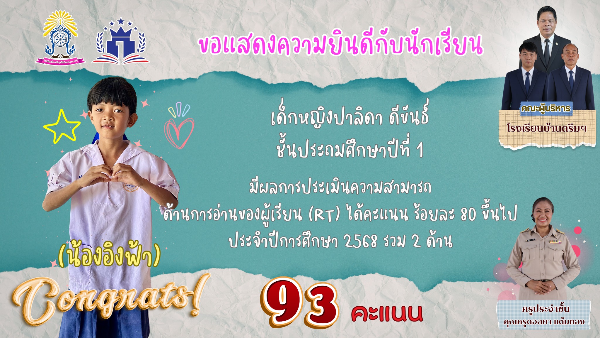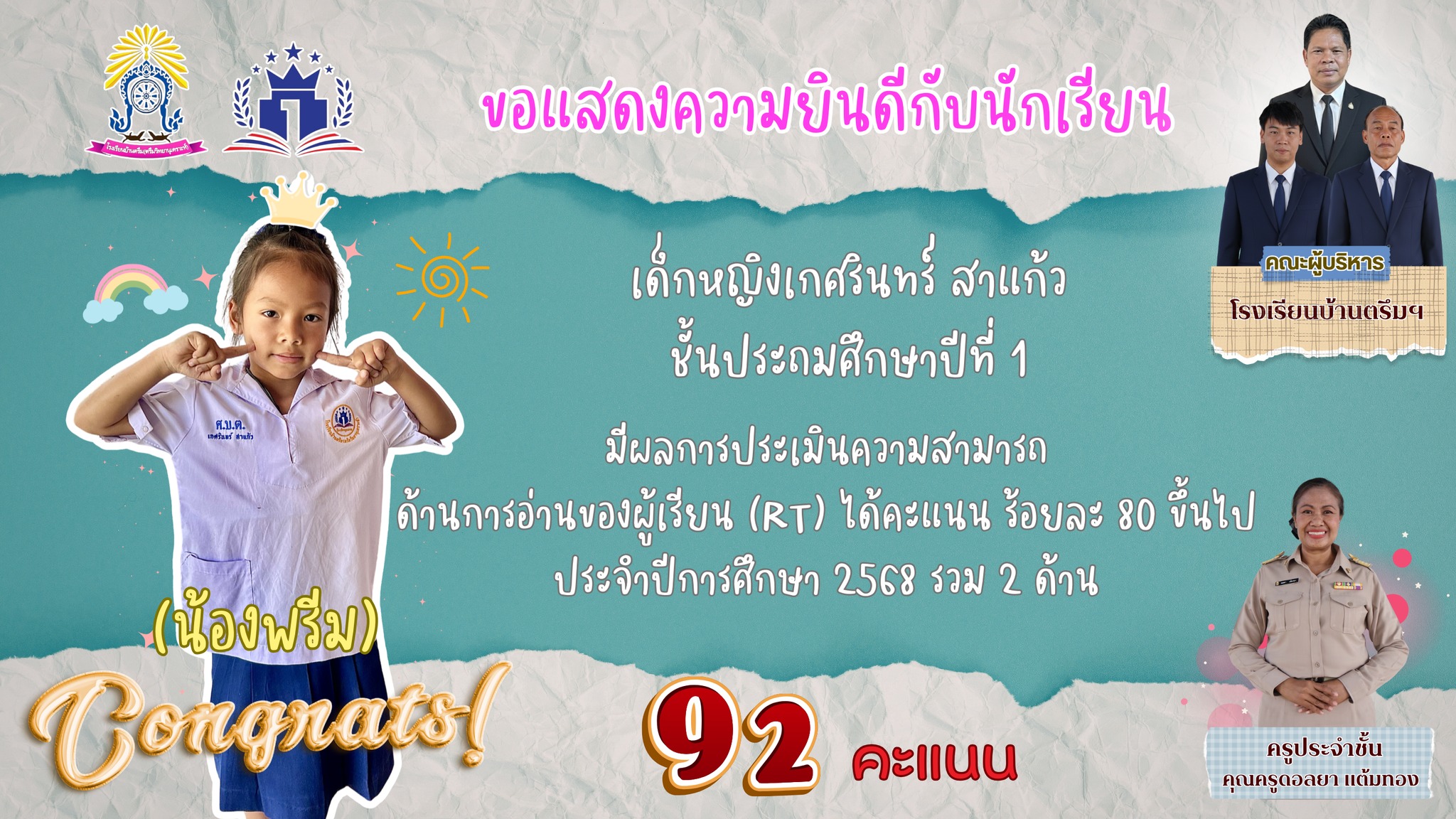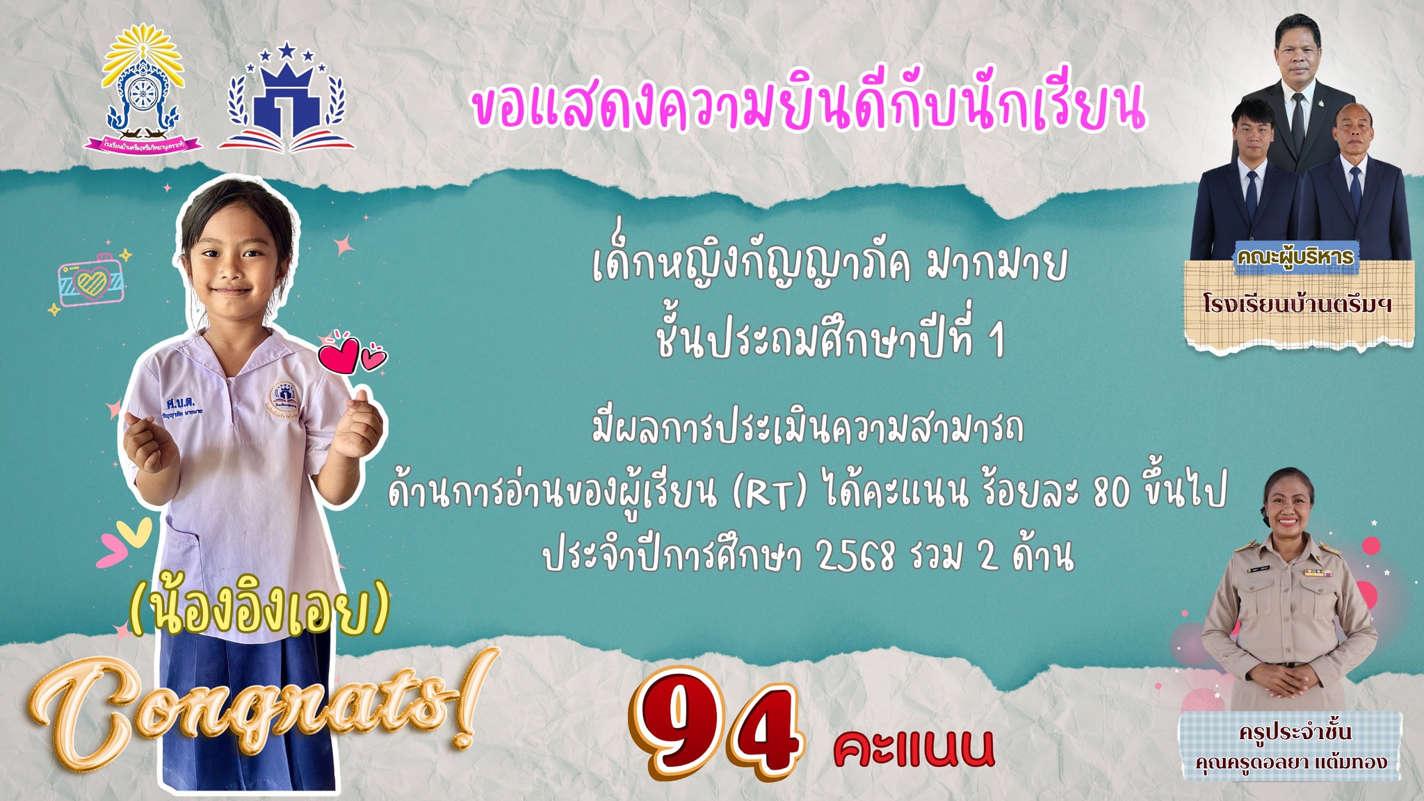 ผลการสอบการอ่านออกเขียนได้ (RT) นักเรียนชั้นประถมศึกษาปีที่ 1 นักเรียนได้คะแนน ร้อยละ 80 ขึ้นไป #คนเก่งศรีตรึม