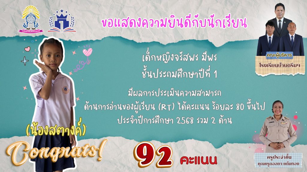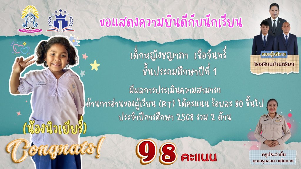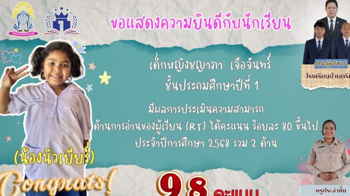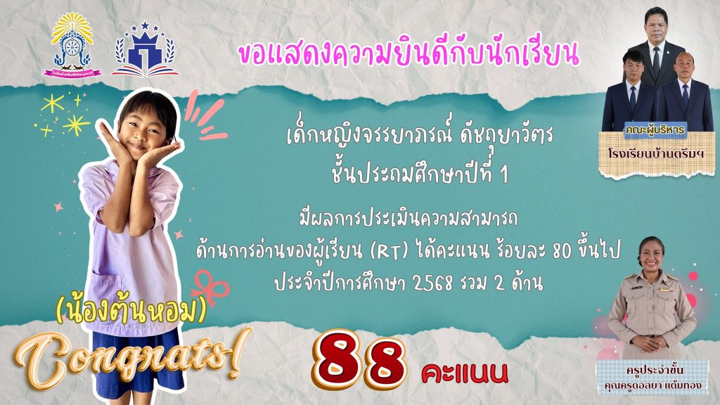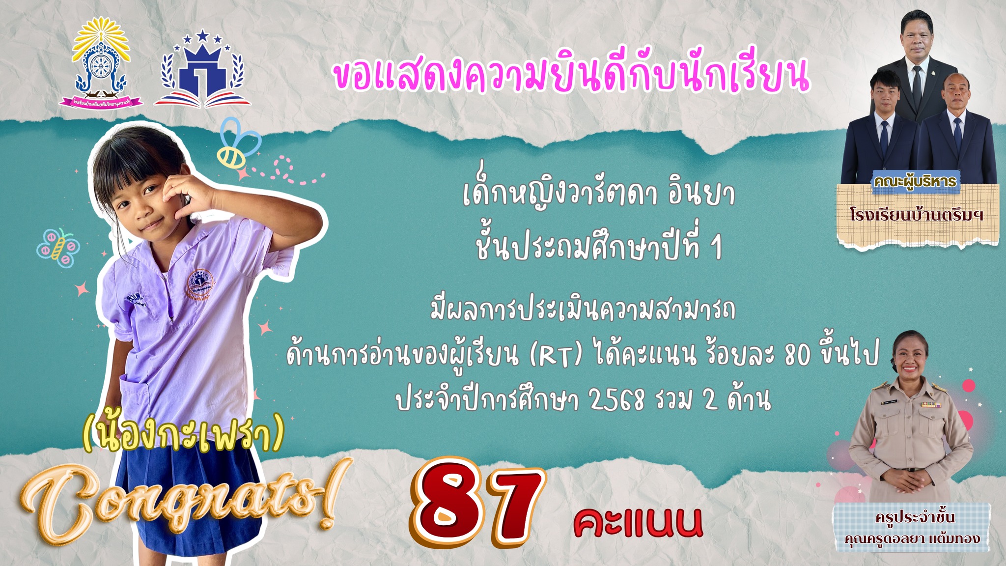 ผลการสอบการอ่านออกเขียนได้ (RT) นักเรียนชั้นประถมศึกษาปีที่ 1 นักเรียนได้คะแนน ร้อยละ 80 ขึ้นไป #คนเก่งศรีตรึม